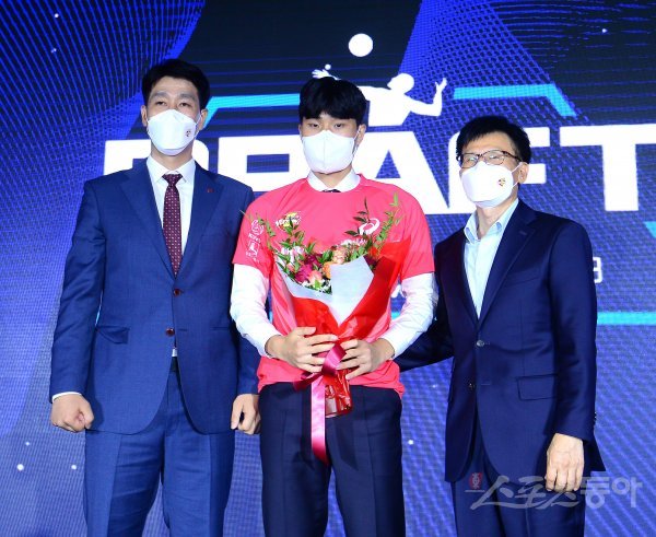 4일 서울 강남구 청담 리베라 호텔에서 열린 2022~2023 KOVO 남자 신인선수 드래프트에서 4라운드 3순위로 한국전력에 지명된 우병헌이 권영민 감독과 기념촬영을 하고 있다.