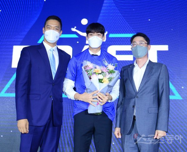 4일 서울 강남구 청담 리베라 호텔에서 열린 2022~2023 KOVO 남자 신인선수 드래프트에서 2라운드 4순위로 삼성화재에 지명된 박성진이 김상우 감독과 기념촬영을 하고 있다.