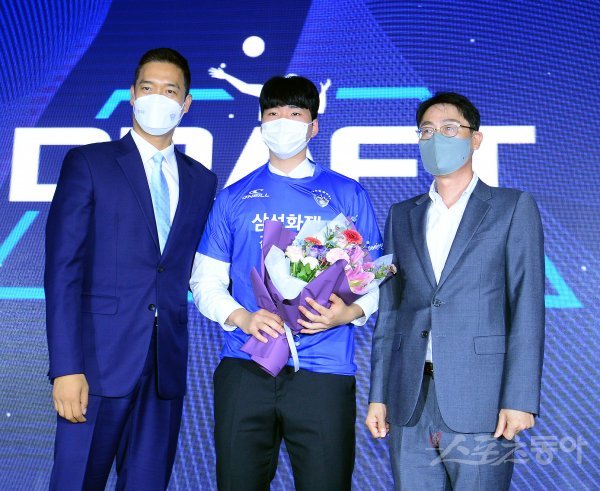 4일 서울 강남구 청담 리베라 호텔에서 열린 2022~2023 KOVO 남자 신인선수 드래프트에서 2라운드 5순위로 삼성화재에 지명된 안지원이 김상우 감독과 기념촬영을 하고 있다.