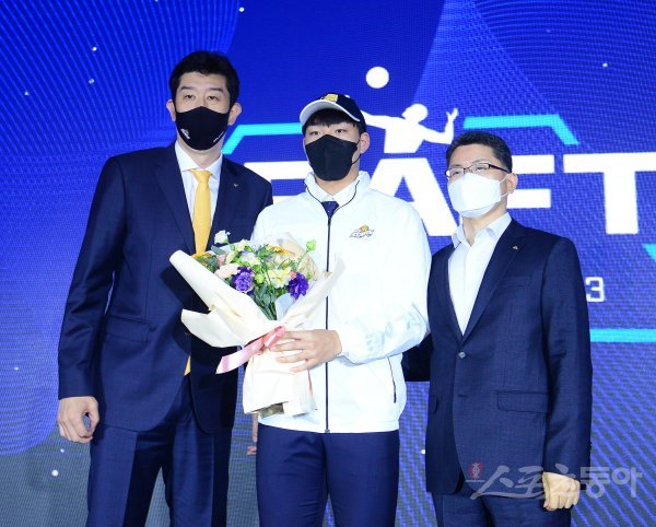 4일 서울 강남구 청담 리베라 호텔에서 열린 2022~2023 KOVO 남자 신인선수 드래프트에서 2라운드 2순위로 KB손해보험에 지명된 배상진이 후인정 감독과 기념촬영을 하고 있다.
