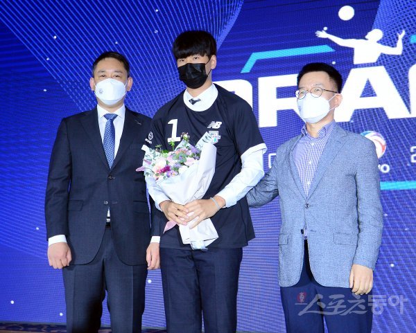 4일 서울 강남구 청담 리베라 호텔에서 열린 2022~2023 KOVO 남자 신인선수 드래프트에서 1라운드 2순위로 현대캐피탈에 지명된 이현승이 최태웅 감독과 기념촬영을 하고 있다.