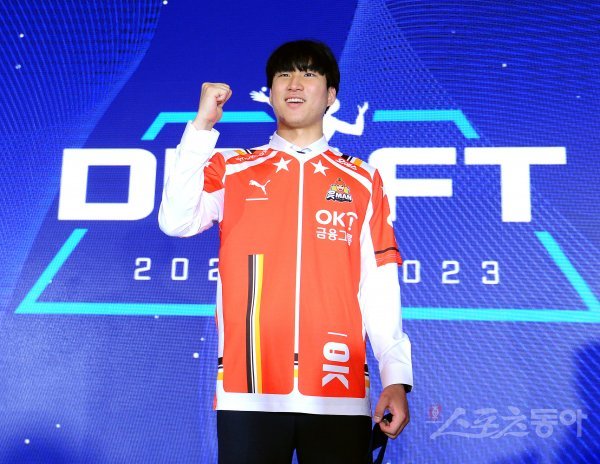 4일 서울 강남구 청담 리베라 호텔에서 열린 2022~2023 KOVO 남자 신인선수 드래프트에서 1라운드 1순위로 OK금융그룹에 지명된 신호진이 기념촬영을 하고 있다. 김종원 기자 won@donga.com