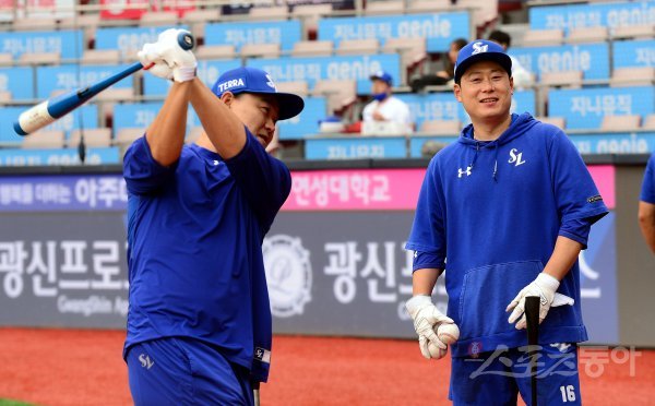 4일 경기도 수원 kt위즈파크에서 ‘2022 신한은행 SOL KBO리그’ kt 위즈와 삼성 라이온즈의 경기가 열린다. 경기 전 삼성 이원석이 동갑내기 친구 오재일의 배팅을 돕고 있다.