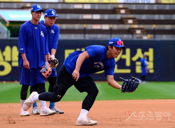 4일 경기도 수원 kt위즈파크에서 ‘2022 신한은행 SOL KBO리그’ kt 위즈와 삼성 라이온즈의 경기가 열린다. 경기 전 삼성 이재현이 수비를 펼치고 있다.