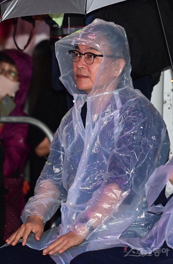 4일 부산 중구 남포동 BIFF광장에서 열린 ‘제27회 부산국제영화제 전야제’에서 배우 김의성이 폭우에 우비를 입고 있다.