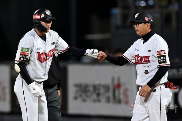 4일 경기도 수원 kt위즈파크에서 ‘2022 신한은행 SOL KBO리그’ kt 위즈와 삼성 라이온즈의 경기가 열렸다. 1회말 2사 2, 3루에서 kt 김민혁이 2타점 적시타를 날린 후 코치의 환영을 받고 있다.