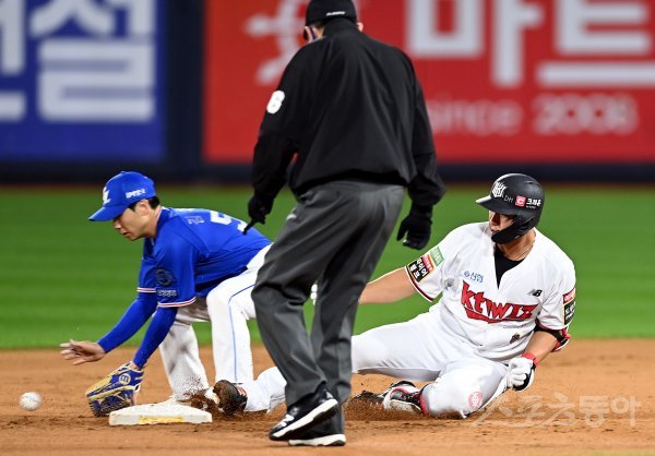 4일 경기도 수원 kt위즈파크에서 ‘2022 신한은행 SOL KBO리그’ kt 위즈와 삼성 라이온즈의 경기가 열렸다. 3회말 2사 2루에서 kt 황재균이 1타점 적시타를 날린 후 실책을 틈타 2루까지 진루하고 있다.