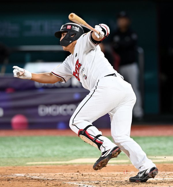 4일 경기도 수원 kt위즈파크에서 ‘2022 신한은행 SOL KBO리그’ kt 위즈와 삼성 라이온즈의 경기가 열렸다. 3회말 2사 2루에서 kt 황재균이 1타점 적시타를 날리고 있다.