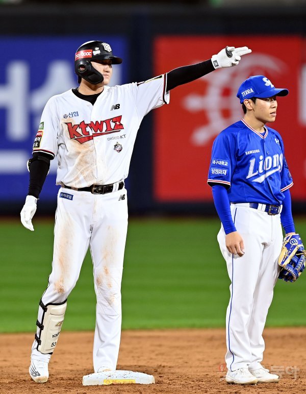4일 경기도 수원 kt위즈파크에서 ‘2022 신한은행 SOL KBO리그’ kt 위즈와 삼성 라이온즈의 경기가 열렸다. 5회말 2사 1, 2루에서 kt 김민혁이 2타점 2루타를 날린 후 환호하고 있다.