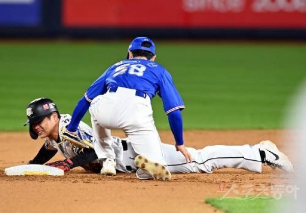 4일 경기도 수원 kt위즈파크에서 ‘2022 신한은행 SOL KBO리그’ kt 위즈와 삼성 라이온즈의 경기가 열렸다. 7회말 무사 1루에서 삼진아웃 때 kt 1루 대주자 권동진이 2루 도루를 성공시키고 있다.