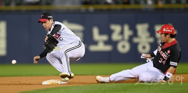 4일 서울 잠실야구장에서 ‘2022 신한은행 MY CAR KBO리그’ KIA 타이거즈와 LG 트윈스 경기가 열렸다. 6회초 무사 1루 KIA 보내기번트 때 LG 오지환이 악송구 된 공을 놓치고 있다.