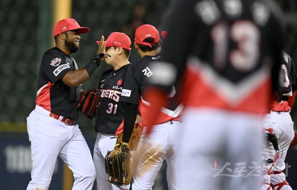4일 서울 잠실야구장에서 ‘2022 신한은행 MY CAR KBO리그’ KIA 타이거즈와 LG 트윈스 경기가 열렸다. 8-3으로 승리한 KIA 선수들이 하이파이브 하고 있다.