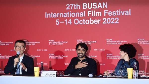 5일 부산 해운대구 우동 영화의전당에서 열린 ‘제27회 부산국제영화제’ 개막작 ‘바람의 향기’ 기자회견에서 하디 모하게흐 감독이 플래시 세례에 웃고 있다.