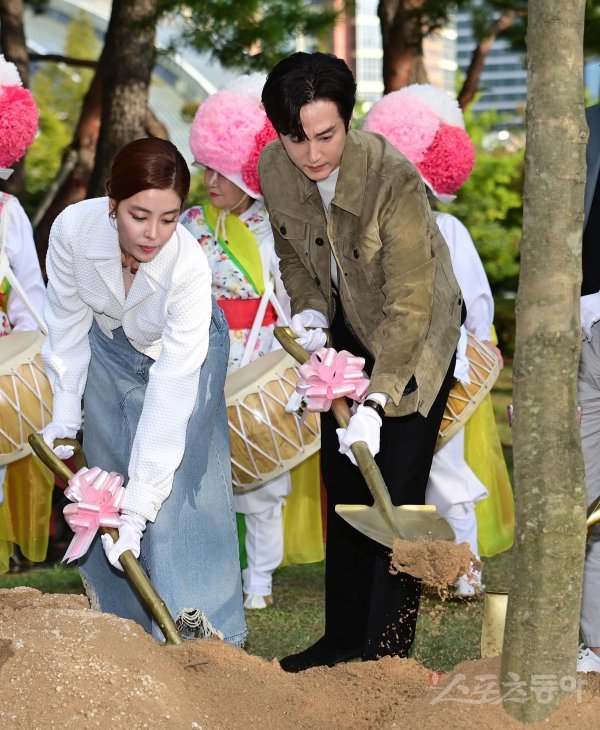 5일 부산 해운대구 우동 영화의전당에서 열린 ‘제27회 부산국제영화제’ 기념 영화의 숲 조성행사에서 배우 김규리, 권율이 고 강수연의 이름을 딴 나무에 흙을 덮고 있다.