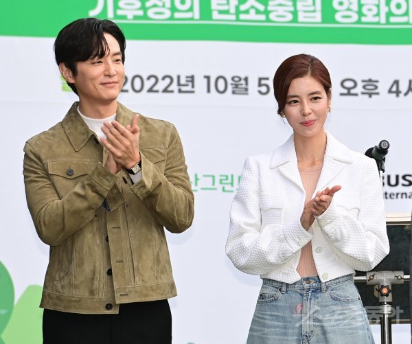 5일 부산 해운대구 우동 영화의전당에서 열린 ‘제27회 부산국제영화제’ 기념 영화의 숲 조성행사에서 배우 권율과 김규리가 손뼉을 치고 있다.