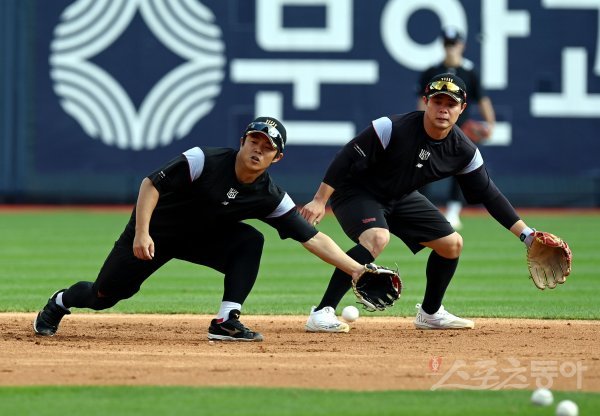 5일 경기도 수원 kt위즈파크에서 ‘2022 신한은행 SOL KBO리그’ kt 위즈와 삼성 라이온즈의 경기가 열린다. 경기에 앞서 kt 외야수 조용호가 권동진과 함께 내야 수비를 훈련하고 있다.