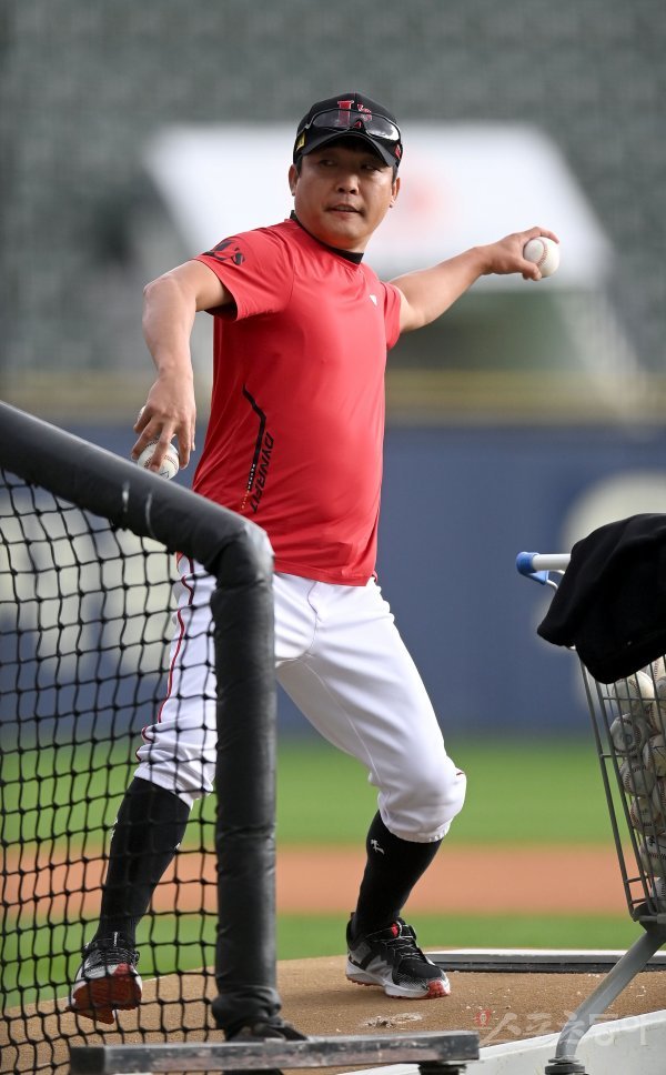 5일 서울 잠실야구장에서 ‘2022 신한은행 MY CAR KBO리그’ SSG 랜더스와 두산베어스 경기가 열린다. SSG 조동화 코치가 배팅볼을 던져주고 있다.