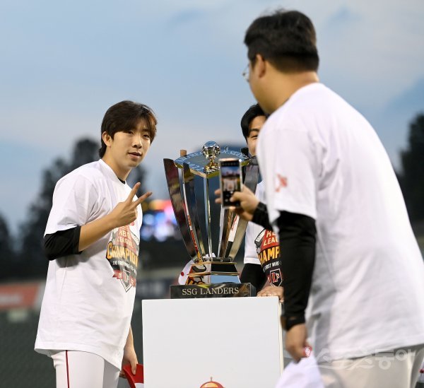 5일 서울 잠실야구장에서 ‘2022 신한은행 MY CAR KBO리그’ SSG 랜더스와 두산베어스 경기가 열렸다. 경기 전 진행된 SSG 정규 시즌 우승 트로피 시상식을 마치고 오원석이 기념촬영을 하고 있다.