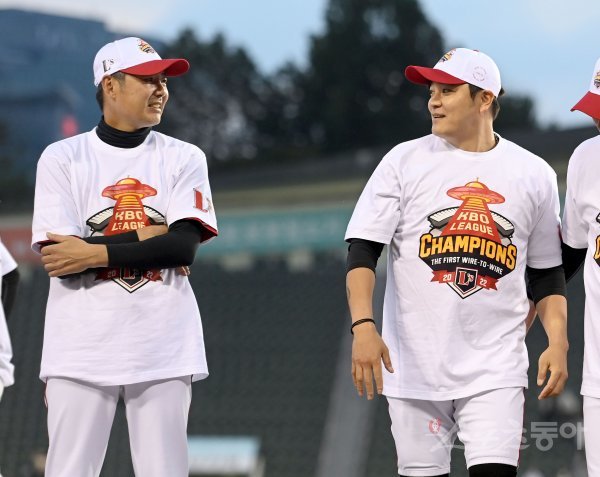 5일 서울 잠실야구장에서 ‘2022 신한은행 MY CAR KBO리그’ SSG 랜더스와 두산베어스 경기가 열렸다. 경기 전 진행된 SSG 정규 시즌 우승 트로피 시상식에서 김원형 감독과 추신수가 이야기하고 있다.