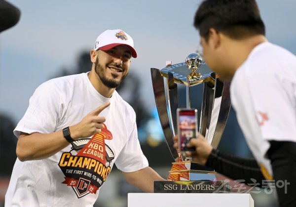 5일 서울 잠실야구장에서 ‘2022 신한은행 MY CAR KBO리그’ SSG 랜더스와 두산베어스 경기가 열렸다. 경기 전 진행된 SSG 정규 시즌 우승 트로피 시상식을 마치고 모리만도가 기념촬영을 하고 있다.
