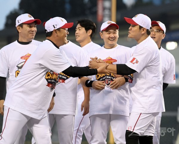 5일 서울 잠실야구장에서 ‘2022 신한은행 MY CAR KBO리그’ SSG 랜더스와 두산베어스 경기가 열렸다. 경기 전 진행된 SSG 정규 시즌 우승 트로피 시상식에 김민재 코치가 추신수를 가운데 자리로 안내하고 있다.