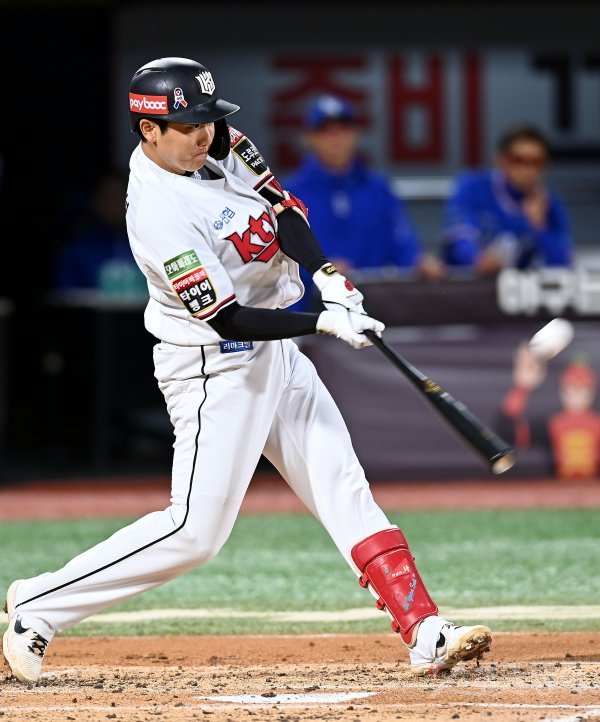 5일 경기도 수원 kt위즈파크에서 ‘2022 신한은행 SOL KBO리그’ kt 위즈와 삼성 라이온즈의 경기가 열렸다. 2회말 1사에서 kt 오윤석이 솔로 홈런을 쏘아 올리고 있다.
