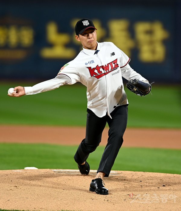 5일 경기도 수원 kt위즈파크에서 ‘2022 신한은행 SOL KBO리그’ kt 위즈와 삼성 라이온즈의 경기가 열렸다. kt 2023년 1라운드 신인투수 김정운이 힘차게 시구를 던지고 있다.