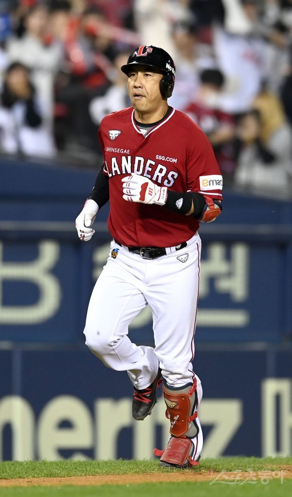 5일 서울 잠실야구장에서 ‘2022 신한은행 MY CAR KBO리그’ SSG 랜더스와 두산베어스 경기가 열렸다. 1회초 1사 1루 SSG 김강민이 좌중월 투런 홈런을 날리고 그라운드를 돌고 있다.