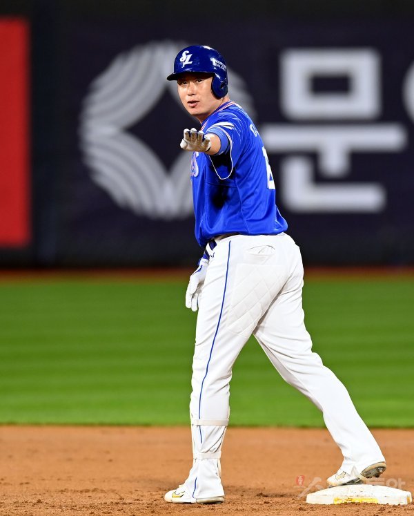 5일 경기도 수원 kt위즈파크에서 ‘2022 신한은행 SOL KBO리그’ kt 위즈와 삼성 라이온즈의 경기가 열렸다. 5회초 무사 2루에서 삼성 이원석이 1타점 동점 2루타를 날린 후 환호하고 있다.
