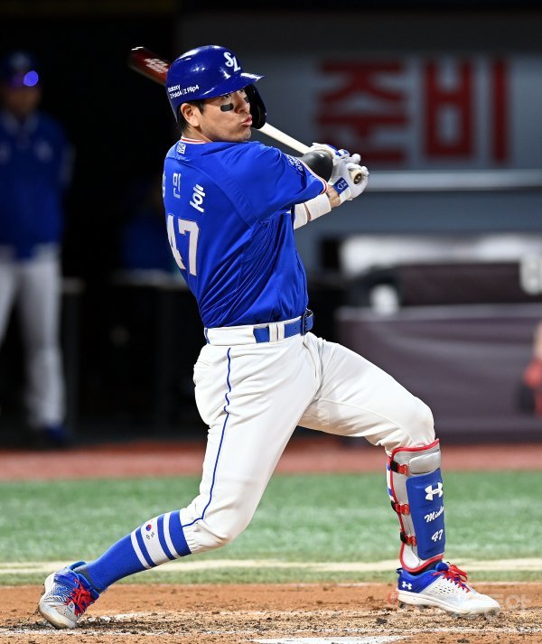 5일 경기도 수원 kt위즈파크에서 ‘2022 신한은행 SOL KBO리그’ kt 위즈와 삼성 라이온즈의 경기가 열렸다. 6회초 무사 1, 3루에서 삼성 강민호가 1타점 적시타를 날리고 있다.