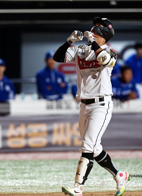 5일 경기도 수원 kt위즈파크에서 ‘2022 신한은행 SOL KBO리그’ kt 위즈와 삼성 라이온즈의 경기가 열렸다. 6회말 1사에서 kt 배정대가 솔로 홈런을 쏘아 올린 후 세리머니를 펼치고 있다.
