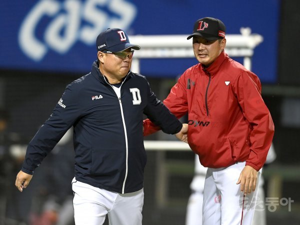 5일 서울 잠실야구장에서 ‘2022 신한은행 MY CAR KBO리그’ SSG 랜더스와 두산베어스 경기가 열렸다. 경기 종료 후 두산 김태형 감독과 SSG 김원형 감독이 인사를 나누고 있다.