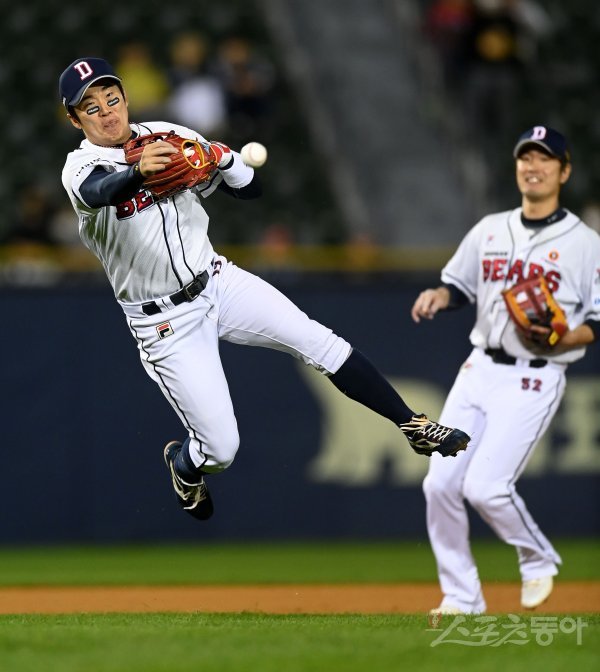 5일 서울 잠실야구장에서 ‘2022 신한은행 MY CAR KBO리그’ SSG 랜더스와 두산베어스 경기가 열렸다. 두산 허경민이 땅볼 타구를 잡아 1루로 송구하고 있다.