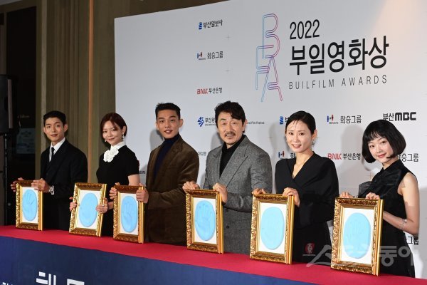 6일 부산 해운대구 중동 시그니엘 부산에서 열린 ‘제31회 2022 부일영화상’ 핸드프린팅 및 레드카펫 행사에서 배우 하준, 이솜, 유아인, 허준호, 김선영, 이유미가 포즈를 취하고 있다.