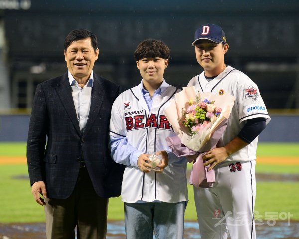 6일 서울 잠실야구장에서 ‘2022 신한은행 MY CAR KBO리그’ 삼성 라이온즈와 두산 베어스 경기가 열렸다. KBO 9월 Fan First 상을 수상한 두산 김인태가 허구연 총재, 시상자 지은혁 군과 기념촬영을 하고 있다 있다.