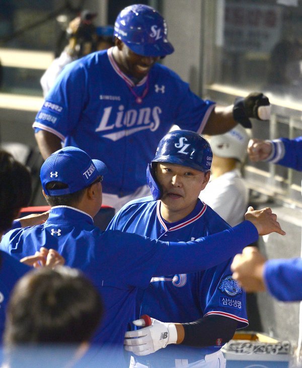6일 서울 잠실야구장에서 ‘2022 신한은행 MY CAR KBO리그’ 삼성 라이온즈와 두산 베어스 경기가 열렸다. 5회초 1사 2루 삼성 오재일이 우월 투런 홈런을 날리고 그라운드를 돌아 홈인해 하이파이브 하고 있다.
