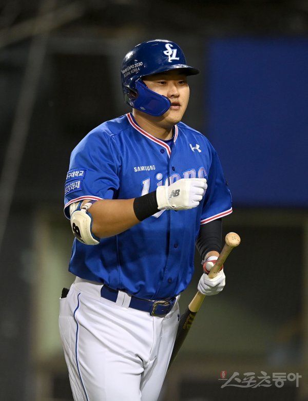 6일 서울 잠실야구장에서 ‘2022 신한은행 MY CAR KBO리그’ 삼성 라이온즈와 두산 베어스 경기가 열렸다. 5회초 1사 2루 삼성 오재일이 우월 투런 홈런을 날리고 그라운드를 돌아 홈인해 하이파이브 하고 있다.
