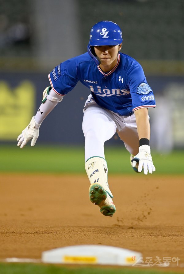 6일 서울 잠실야구장에서 ‘2022 신한은행 MY CAR KBO리그’ 삼성 라이온즈와 두산 베어스 경기가 열렸다. 3회초 1사 삼성 김현준이 중전 안타를 치고 3루까지 달려 세이프 되고 있다…