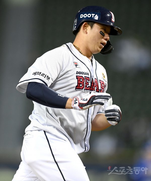 6일 서울 잠실야구장에서 ‘2022 신한은행 MY CAR KBO리그’ 삼성 라이온즈와 두산 베어스 경기가 열렸다. 4회말 2사 두산 김민혁이 좌월 솔로 홈런을 날리고 그라운드를 돌며 하이파이브 하고 있다.