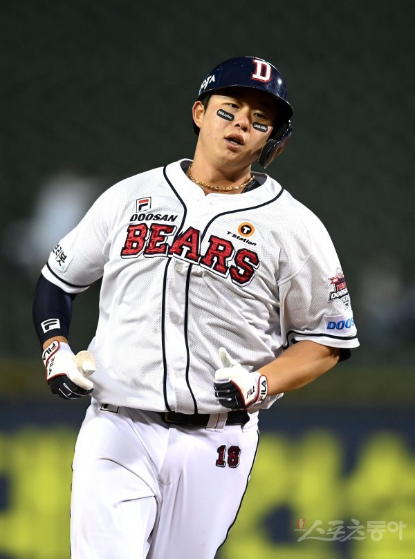 6일 서울 잠실야구장에서 ‘2022 신한은행 MY CAR KBO리그’ 삼성 라이온즈와 두산 베어스 경기가 열렸다. 4회말 2사 두산 김민혁이 좌월 솔로 홈런을 날린 후 그라운드를 돌고 있다.