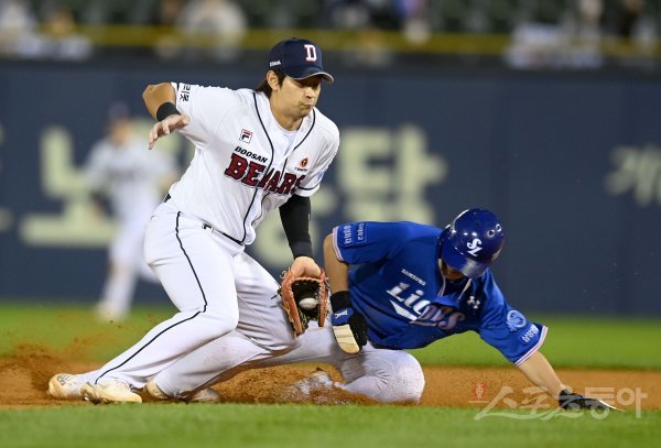 6일 서울 잠실야구장에서 ‘2022 신한은행 MY CAR KBO리그’ 삼성 라이온즈와 두산 베어스 경기가 열렸다. 7회초 2사 1루 상황에서 삼성 1루주자 강한울이 2루 도루에 성공하고 있다.