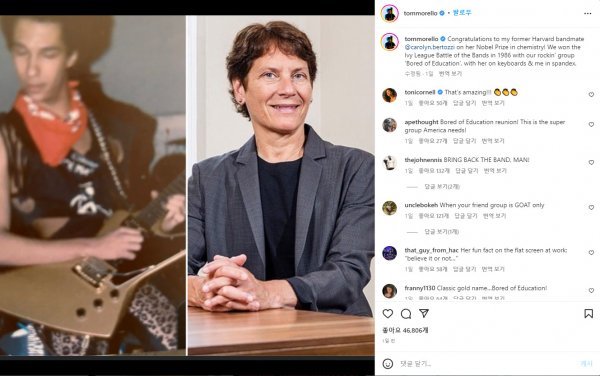 미국의 랩 메탈 밴드 레이지 어게인스트 더 머신(RATM)의 기타리스트 톰 모렐로(58)가 올 노벨 화학상 수상자 중 한 명인 캐럴린 R. 버토지 미국 스탠퍼드대 화학과 교수(56·여)에게 축하 인사를 건넸다.