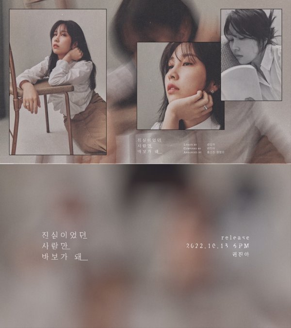 영상에는 가을 느낌이 물씬 풍기는 아련한 분위기의 권진아의 이미지가 담겼다. 이와 함께 신곡 ‘진심이었던 사람만 바보가 돼’ 음원 일부가 공개, 중독성 높은 멜로디가 귀를 사로잡으며 신곡에 대한 기대감을 고조시켰다.