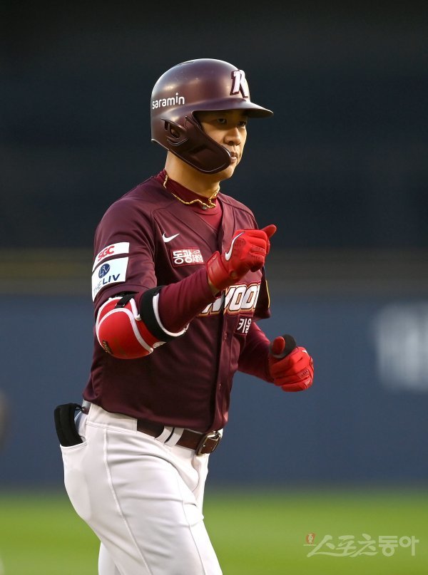 8일 서울 잠실야구장에서 ‘2022 신한은행 MY CAR KBO리그’ 키움 히어로즈와 두산 베어스 경기가 열렸다. 3회초 1사 1루 키움 송성문이 선제 우월 투런 홈런을 날리고 그라운드를 돌며 홈인해 하이파이브 하고 있다.