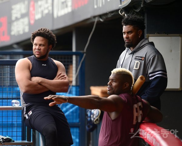 8일 서울 잠실야구장에서 ‘2022 신한은행 MY CAR KBO리그’ 키움 히어로즈와 두산 베어스 경기가 열렸다. 경기 전 두산 페르난데스, 모레노 트레이닝 코치와 키움 푸이그가 이야기를 하고 있다.