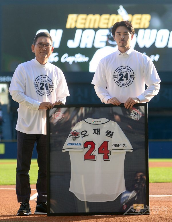 8일 서울 잠실야구장에서 ‘2022 신한은행 MY CAR KBO리그’ 키움 히어로즈와 두산 베어스 경기가 열렸다. 경기 전 두산 오재원이 은퇴식에서 전풍 사장에게 유니폼을 받고 있다.