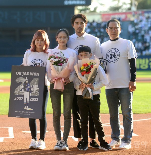 8일 서울 잠실야구장에서 ‘2022 신한은행 MY CAR KBO리그’ 키움 히어로즈와 두산 베어스 경기가 열렸다. 경기 전 두산 오재원이 은퇴식에서 팬클럽 대표와 기념 촬영을 하고 있다.