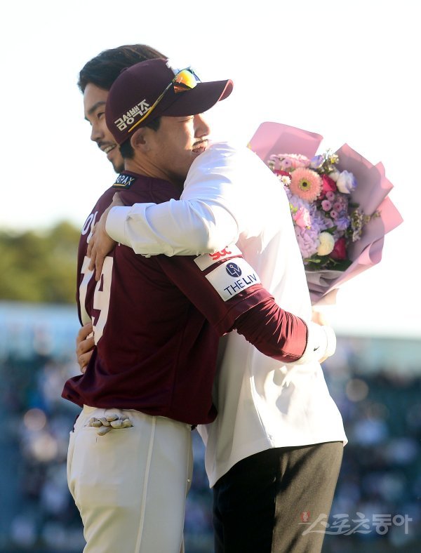 8일 서울 잠실야구장에서 ‘2022 신한은행 MY CAR KBO리그’ 키움 히어로즈와 두산 베어스 경기가 열렸다. 경기 전 두산 오재원이 은퇴식에서 키움 이용규에게 축하꽃다발을 받고 있다.