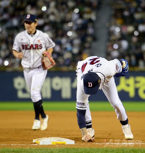 8일 서울 잠실야구장에서 ‘2022 신한은행 MY CAR KBO리그’ 키움 히어로즈와 두산 베어스 경기가 열렸다. 9회초 프로 마지막 수비를 마친 두산 오재원이 더그아웃으로 들어가며 그라운드 홁을 챙기고 있다.