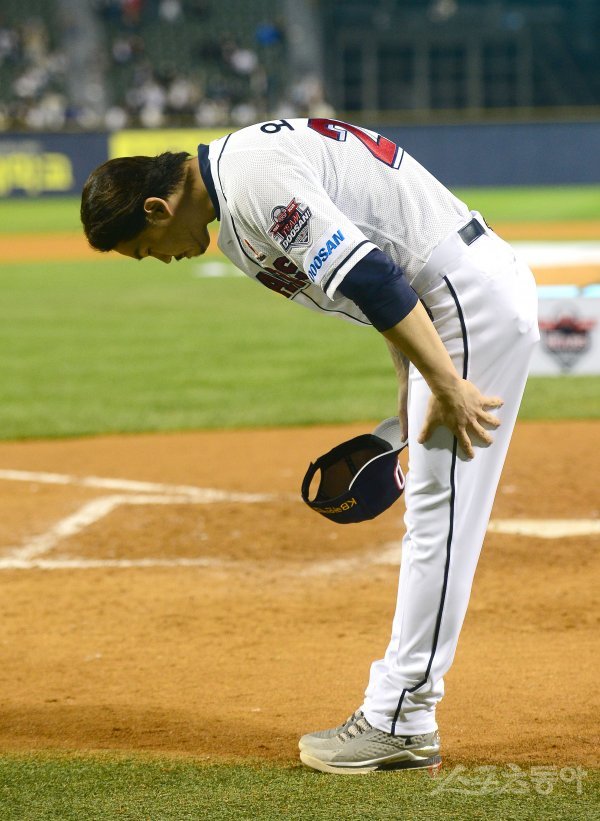 8일 서울 잠실야구장에서 ‘2022 신한은행 MY CAR KBO리그’ 키움 히어로즈와 두산 베어스 경기가 열렸다. 두산 오재원이 은퇴식에서 팬들에게 인사하고 있다.
